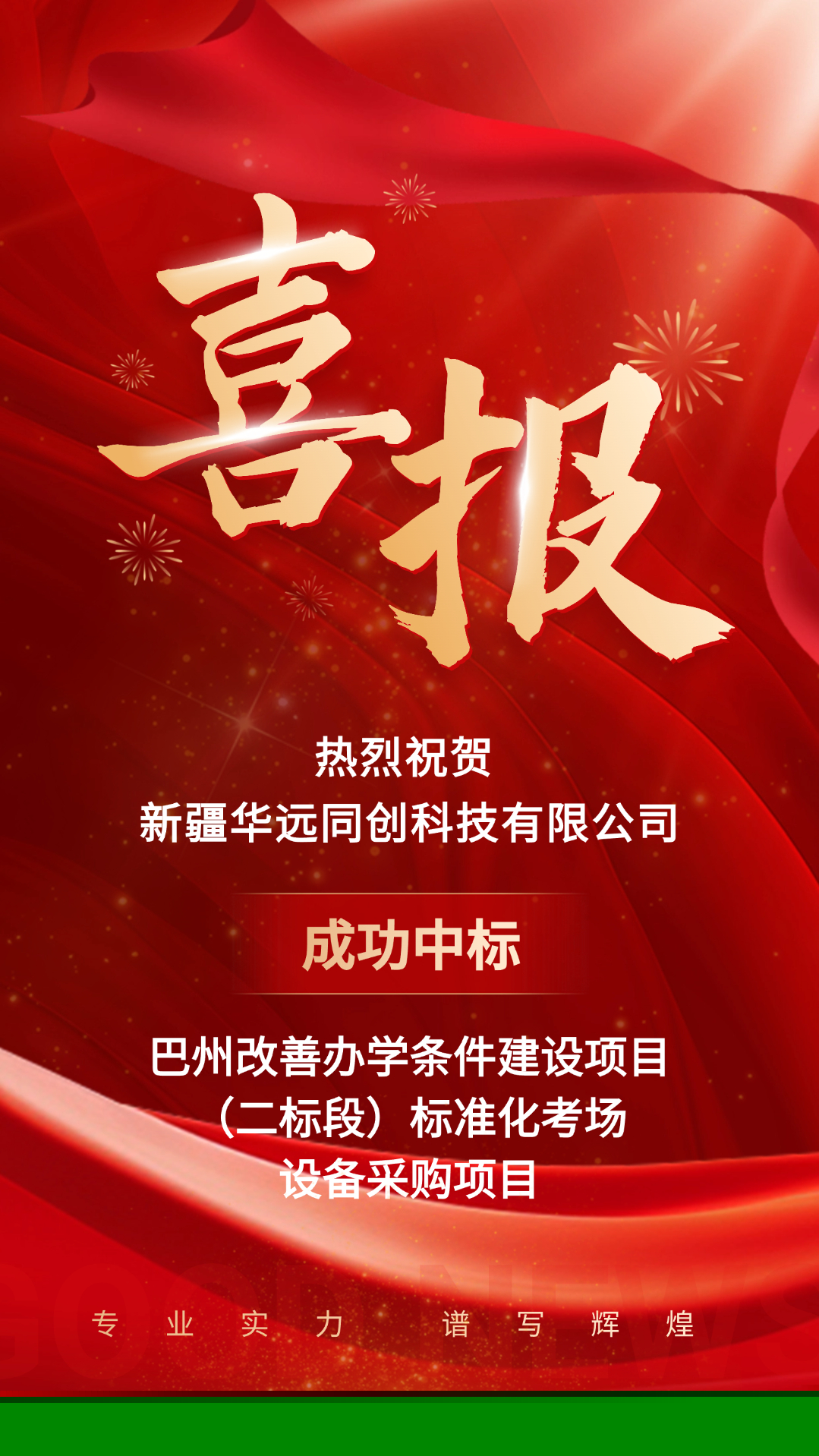 金秋時(shí)節(jié)收獲多,中標(biāo)喜訊乘“豐”來(lái)!近日,在全體員工的共同努力下,新疆華遠(yuǎn)同創(chuàng)科技有限公司成功中標(biāo)巴州改善辦學(xué)條件建設(shè)項(xiàng)目(二標(biāo)段)標(biāo)準(zhǔn)化考場(chǎng)設(shè)備采購(gòu)項(xiàng)目。